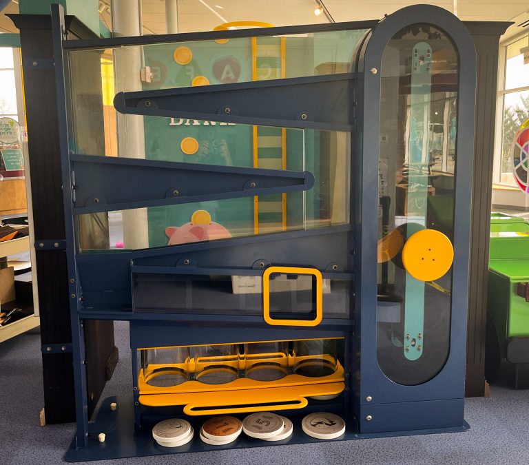 Kansas Children’s Discovery Center contacted Process Curiosity about a Coin Sorter exhibit we had completed for another institution. We took this original concept and created a unique version specifically for them. This playful exhibit educates users about money, focusing on coins. The guest places 10″ and larger-sized coins into the armature and then manipulates the wheel to see them begin their journey through the interactive. It’s a fun way to learn about money and then see how the size of each coin dictates its final destination.