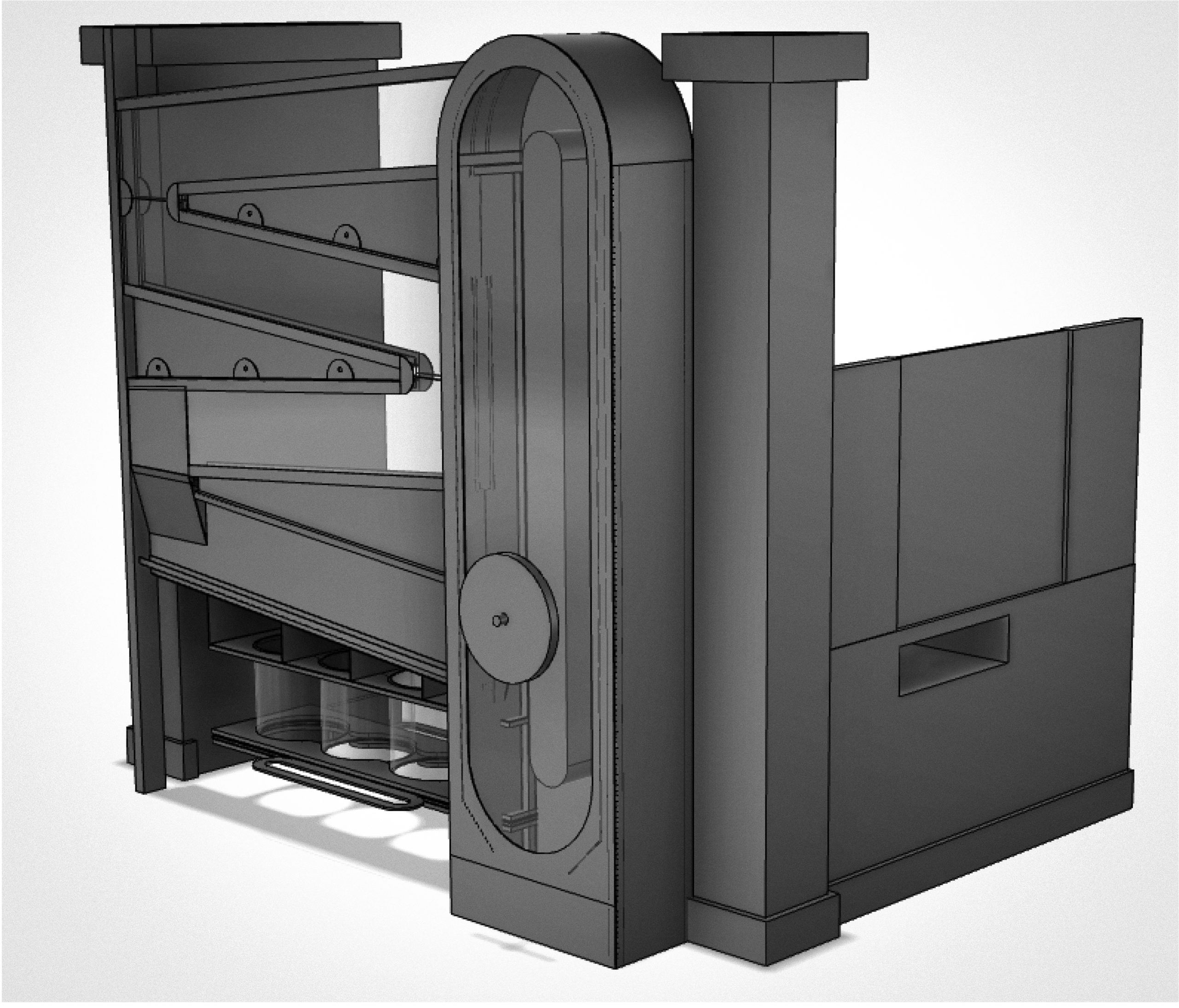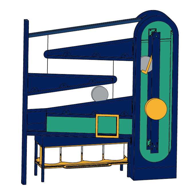 The Coin Sorter is a great attention grabber. Its large size and exposed mechanical workings incite curiosity from the guests. They can hold the large Sintra coins in their hands and discuss the value of each unit. They are encouraged to combine different coins to help with early math skills. The guest can then insert the coins, crank the wheel, and watch the coin move up the conveyor to its highest point before witnessing it move side to side down the tray through clear Polycarbonate. As it gets to the bottom, they see how the size determines the slot the coin will fall through. This process is repeated with each different sized coin to determine the final tally amount. The Coin Sorter is an excellent interactive for other museums.