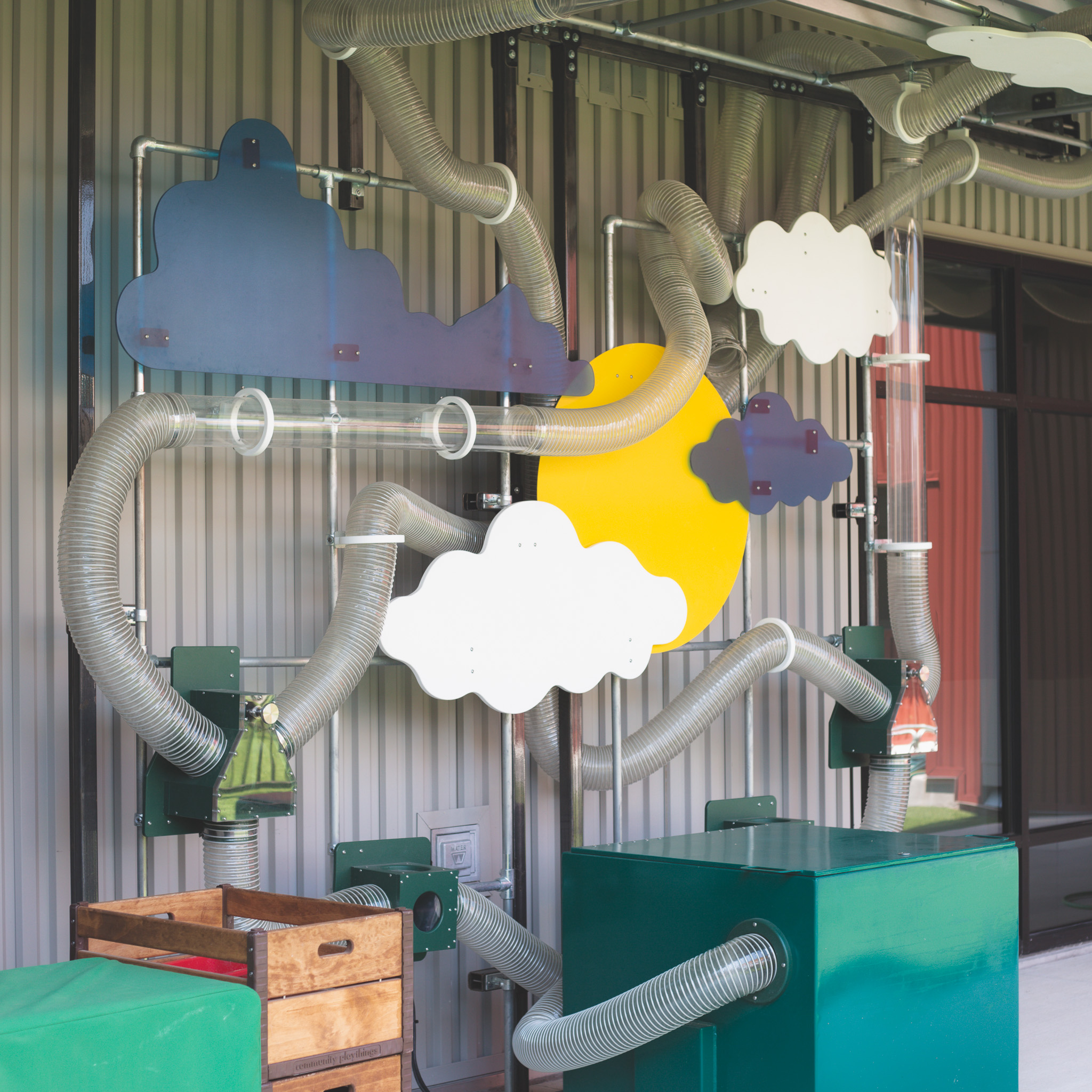 CDC consisted predominantly of three separate, fenced playground areas. Each playground will be designated to a specific age range (0 to 18 months, 18 to 3 years, 3 to 5 years). Exhibits are designed to work with the preexisting fence lines around each playground, providing experiences both inside and outside of the zones. Additional exhibits will be installed in the empty spaces that remain outdoors. Two large roofed patios focused on exhibits themes of role play, free build, wind, and simple machines. Exhibits are designed to cater to each individual age range on the inside of each playground. Exhibits themes are focused to match the natural aesthetic of the playground equipment to create a more cohesive environmental look and feel.