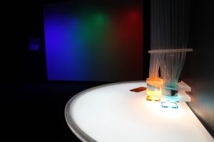 A Light Island invites visitors to bend white light with prisms to reveal the full color spectrum that lies within. To reinforce this concept, as visitors pass through the light of the Color Shadows wall, the edges of their shadows reveal the overlapping colors that combine to white. In addition to these exhibits, there are more that continue to explore how light travels, how light looks with differing temperature materials, how fiber optic affects light, and much more.