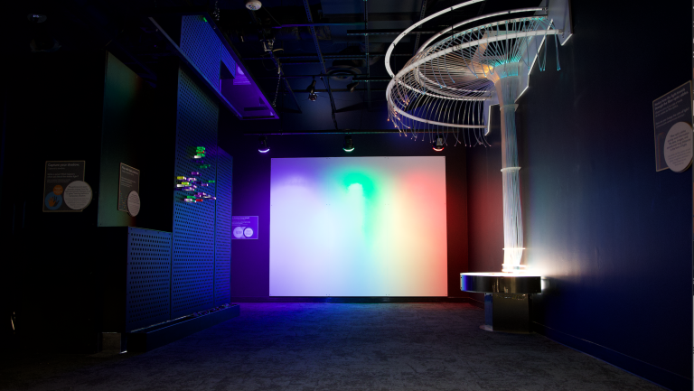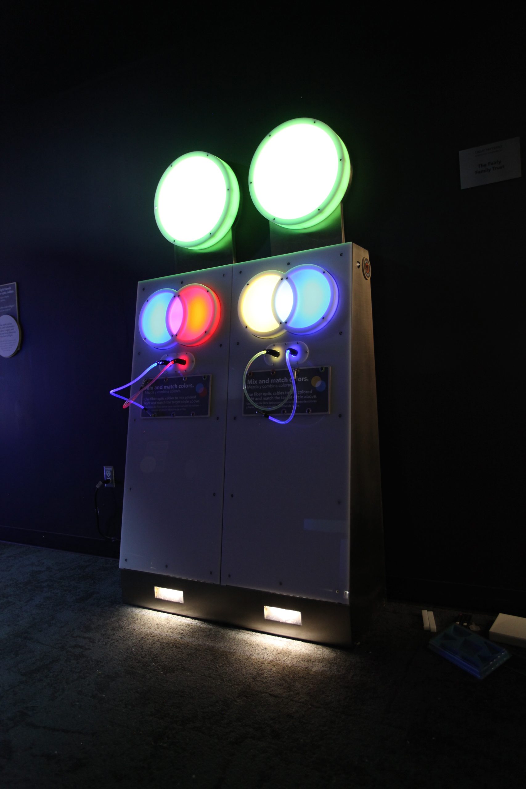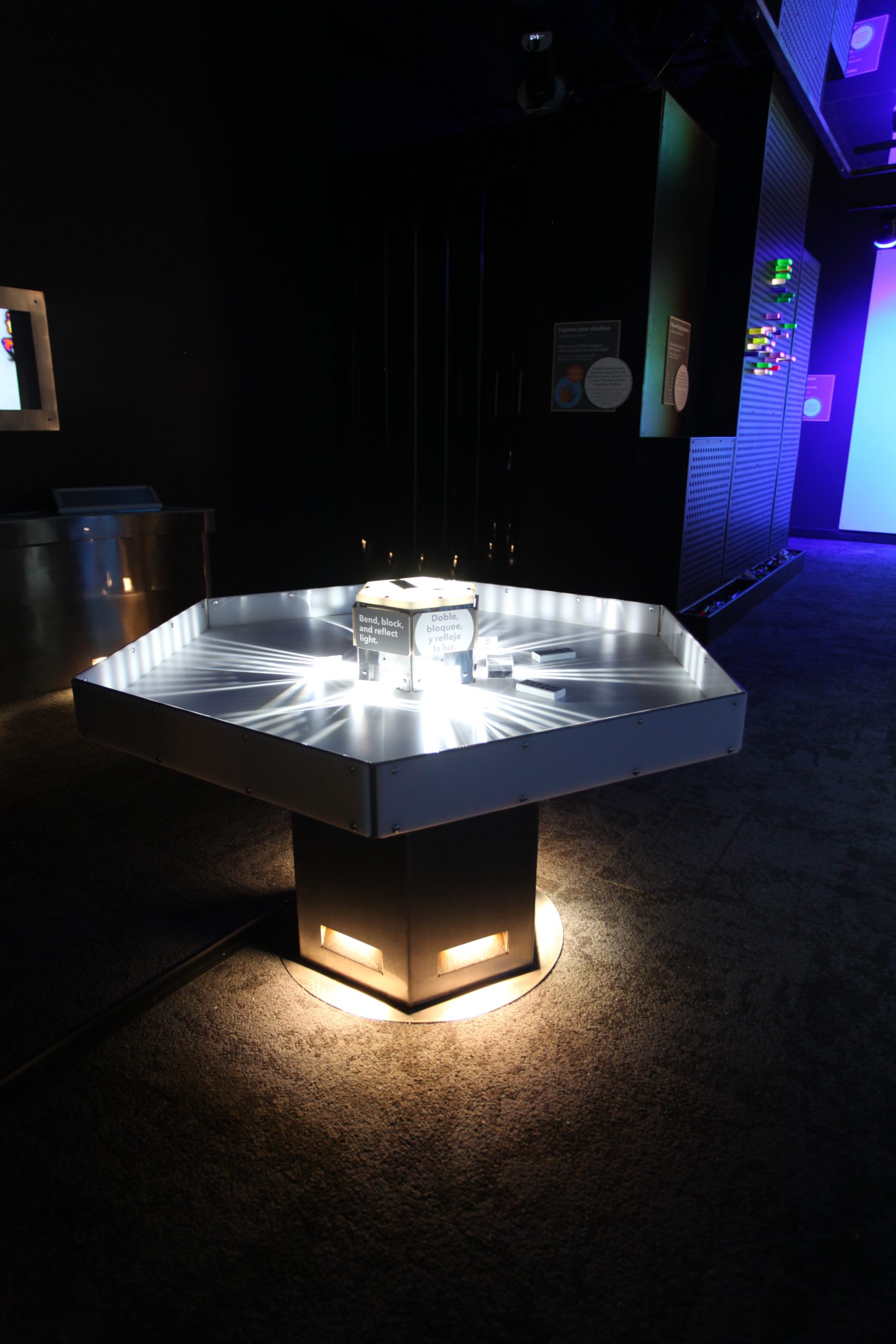 A Light Island invites visitors to bend white light with prisms to reveal the full color spectrum that lies within. To reinforce this concept, as visitors pass through the light of the Color Shadows wall, the edges of their shadows reveal the overlapping colors that combine to white. In addition to these exhibits, there are more that continue to explore how light travels, how light looks with differing temperature materials, how fiber optic affects light, and much more.